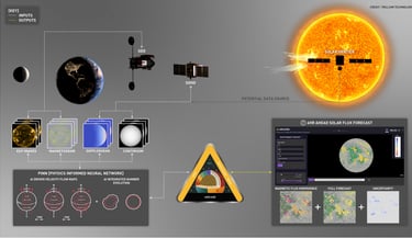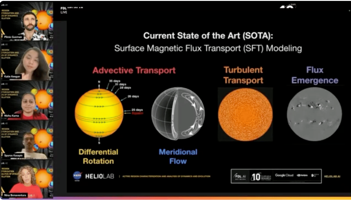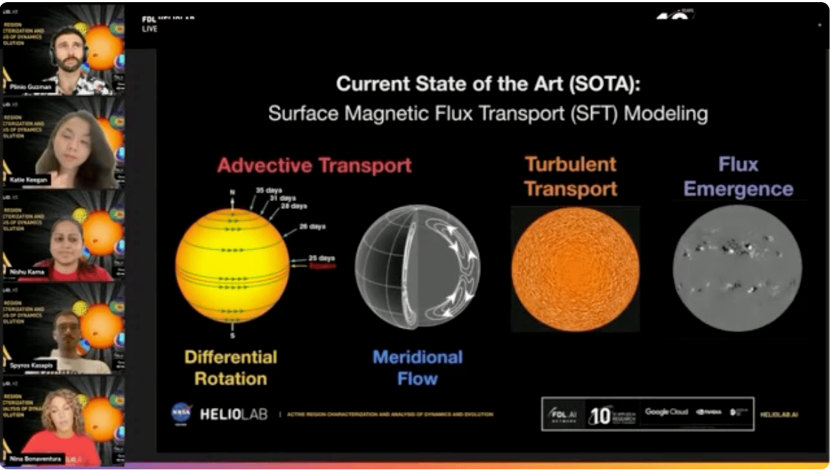 Throughout the summer of 2025, I worked intensively in an "AI bootcamp for space geniuses" helping develop a novel, physics-informed 'gray box' machine learning (ML) model that pushes the frontier of artificial intelligence (AI) in space weather forecasting, supported by NASA, Google Cloud, and Nvidia. Personal contributions include the development of a PyTorch machine learning program that learns the parameters of the physical processes of solar surface differential rotation and meridional flow, from five different types of input solar imaging observations obtained with the Solar Dynamics Observatory, using Last-Layer Laplace Approximation for uncertainty quantification.