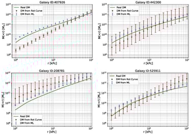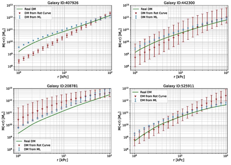 Figure 9 of de los Rios et al. (2023) comparing the simulated `real’ DM distribution with the method of rotation curve fitting (brown triangles) and the ML method we employ here (blue dots), highlighting the success of our approach in reliably and accurately estimating the DM mass in galaxies.