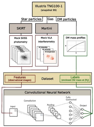 For my 'pandemic project', I worked with a research collaboration of non-astronomer physicists and data scientists, Dark Machines, to lead the astronomical image analysis and galaxy science components of an ambitious study centered on a novel application of Convolutional Neural Networks (CNNs) to photometric galaxy images and neutral hydrogen gas intensity and velocity maps, to predict the dark matter (DM) mass and distribution in galaxies, for the first time (de los Rios et al. 2023). This involved the simulation of optical (stellar-light) galaxy emission in images as it would be observed by the Sloan Digital Sky Survey (SDSS), starting with the idealized form output by the radiative transport code SKIRT, then utilizing Python Astropy via the PTS library to add instrumental effects. The resulting suite of mock photometric images in the five SDSS ugriz bands served as input to our machine learning model that helped train it to output accurate galaxy DM profiles; and represented half of the 'mock Universe' from which physical galaxy parameters were measured in order to constrain DM mass estimates.
